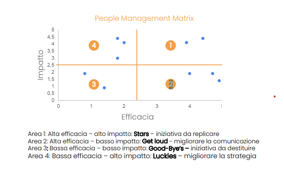 Consente di analizzare ogni singola iniziativa di gestione HR, collocarla all’interno di una delle 5 dimensioni e misurarla in termini di impatto ed efficacia. Attraverso la People Management Matrix, fornisce indicazioni immediate su come ottimizzare le iniziative.